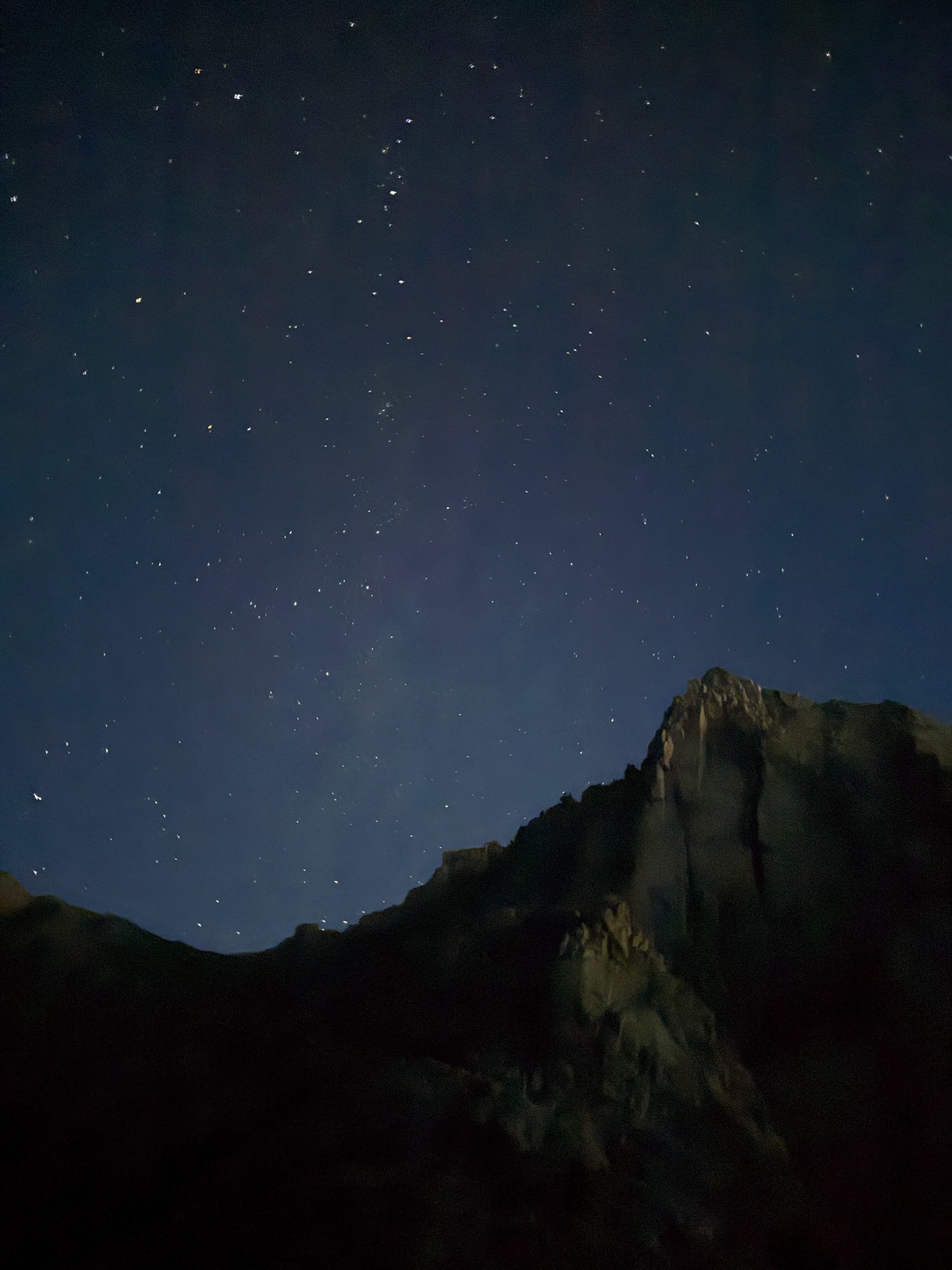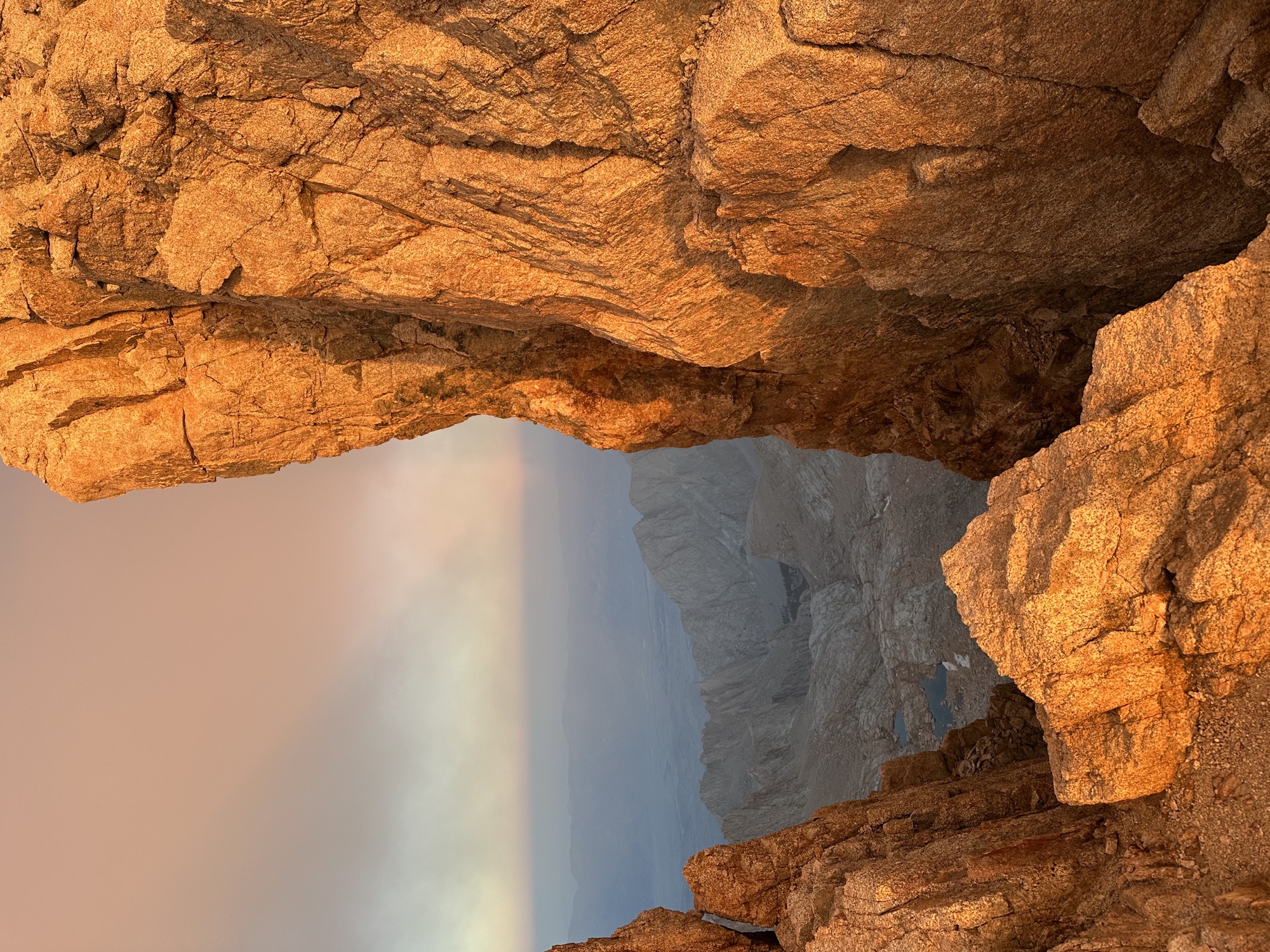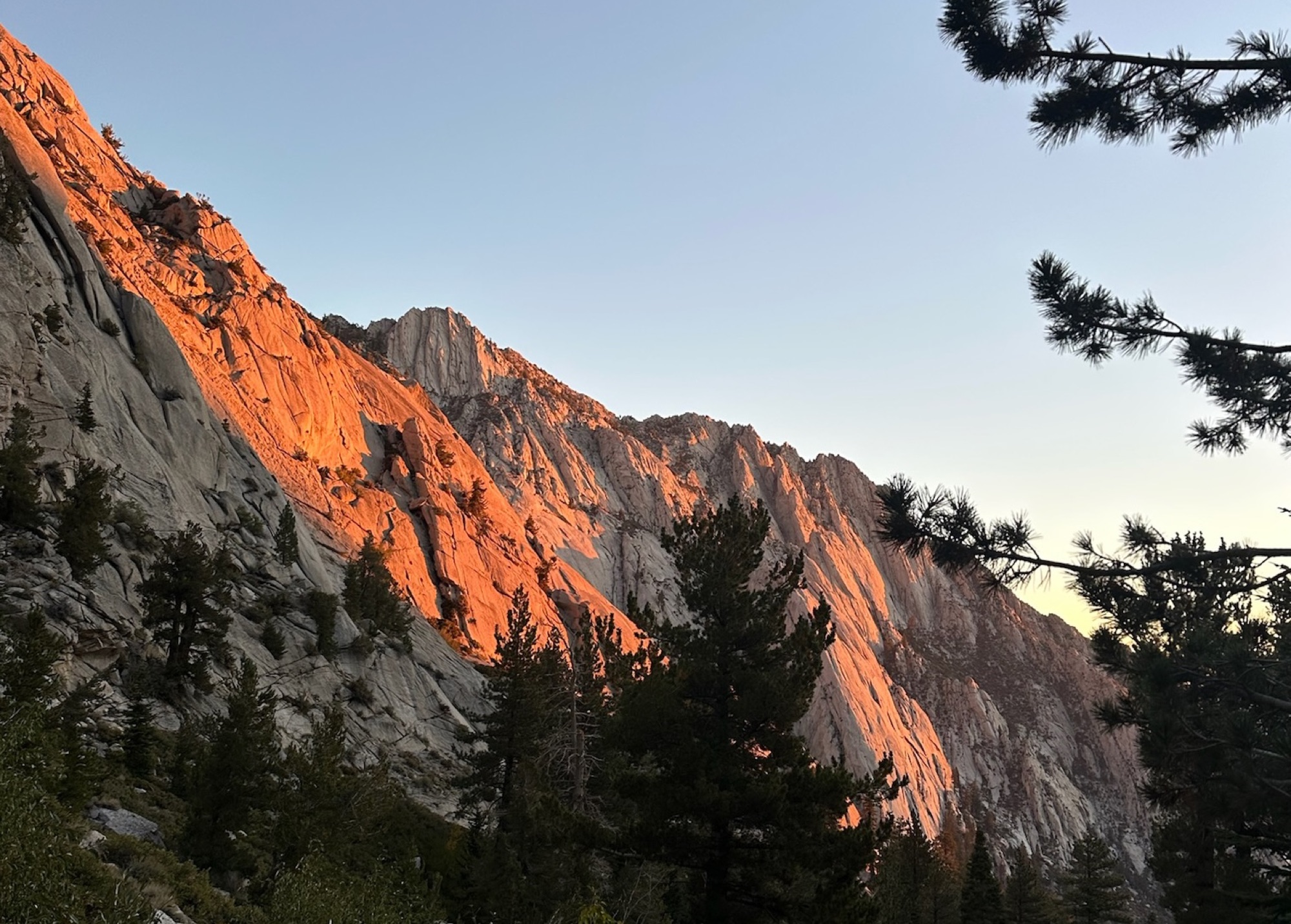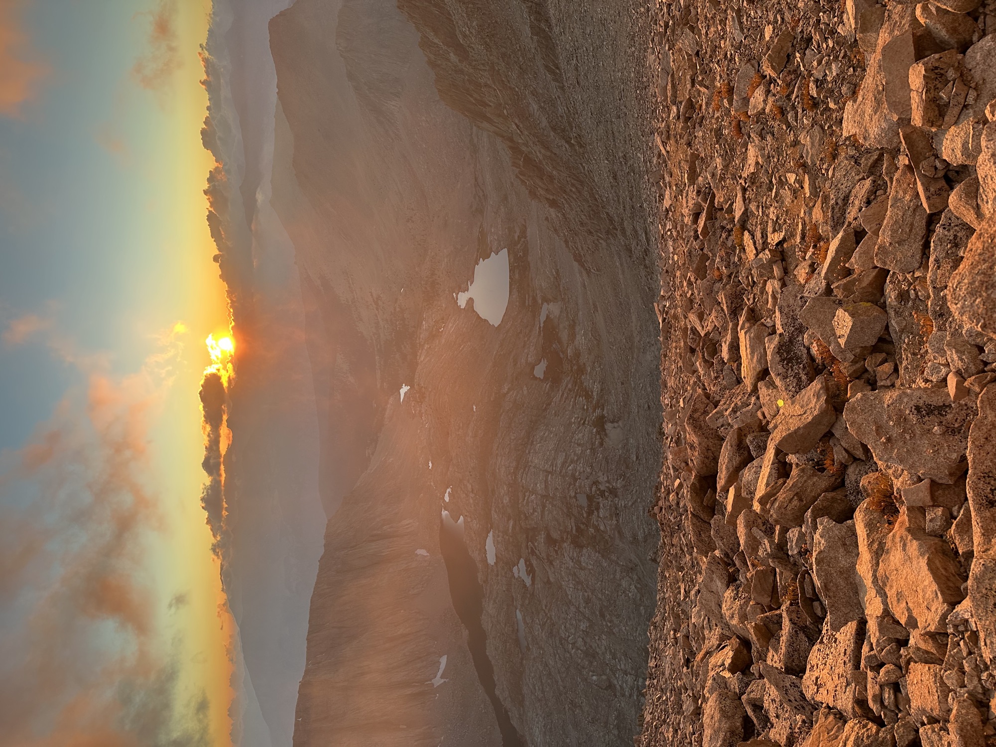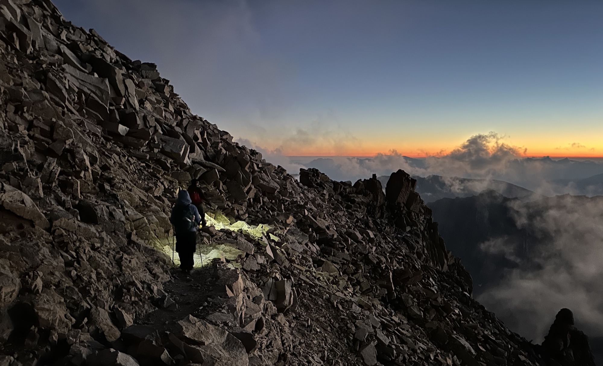 Daylight comes. After hiking for hours by headlamp, the rising sun reveals the hard, jagged landscape we've been traversing. I feel like I've been transported. We're close to 11,000 feet.